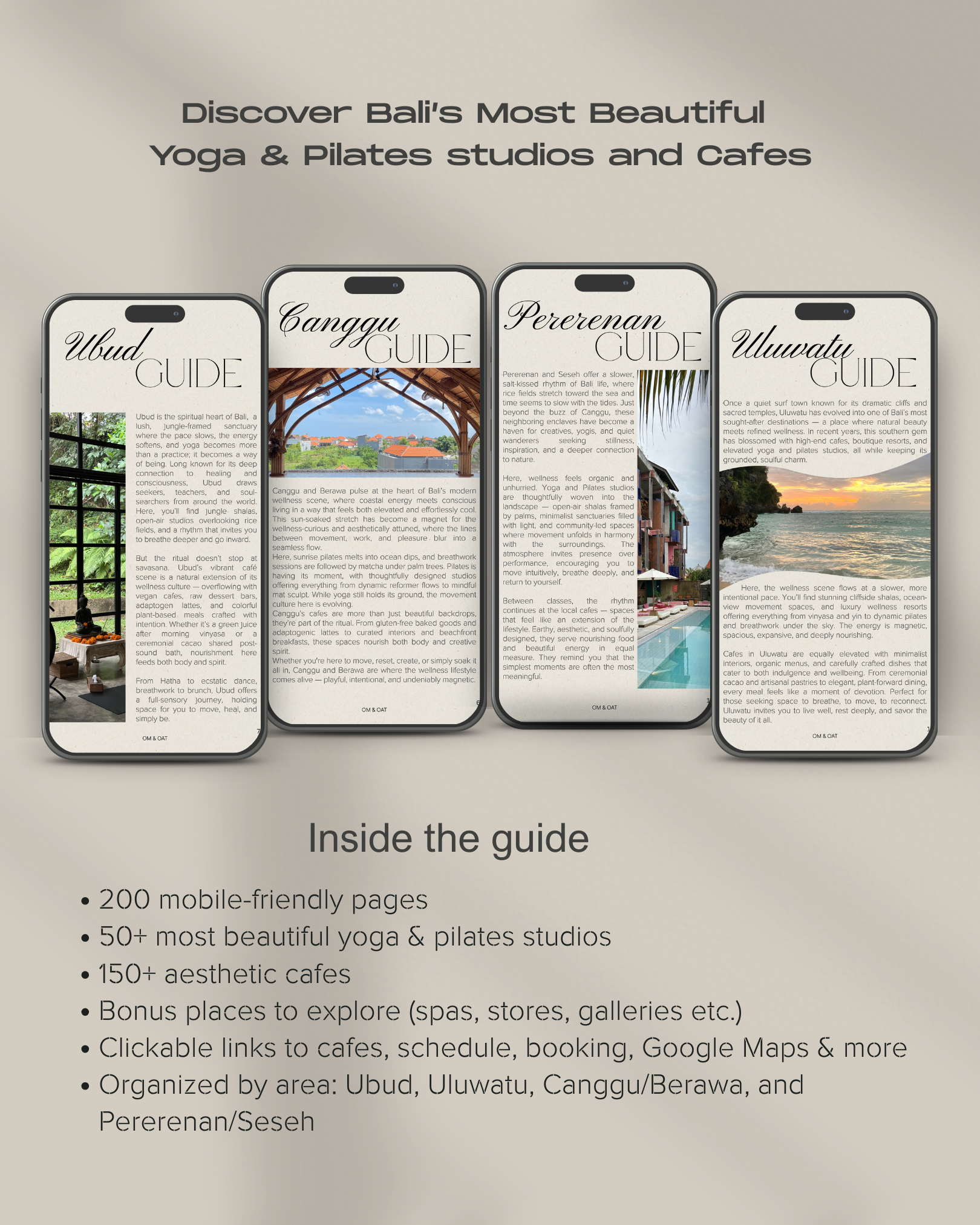 Discover over 50 of the island’s most beautiful yoga and pilates studios, each thoughtfully paired with aesthetic, health-conscious cafes just a short walk away.