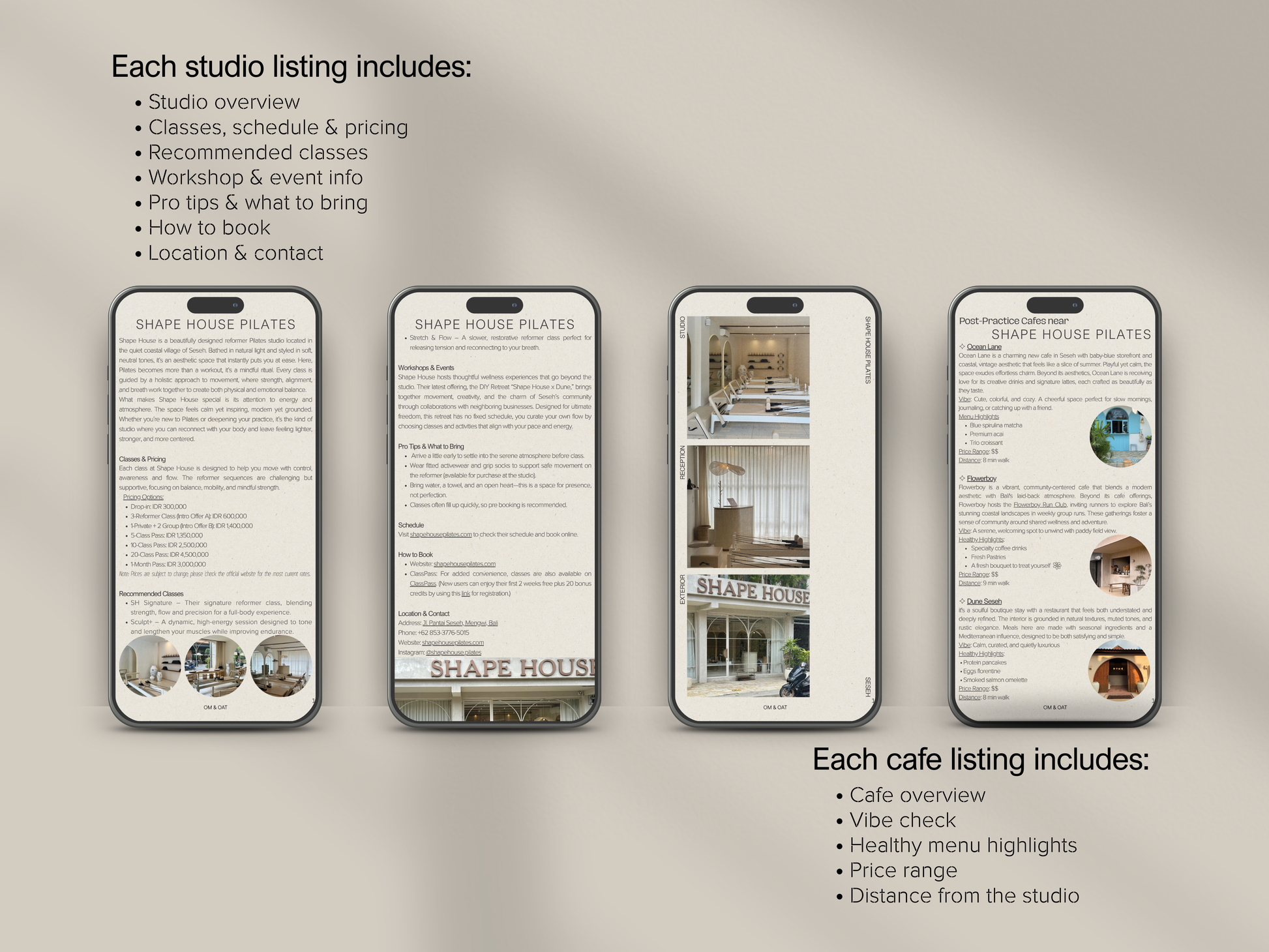 A thoughtfully curated digital guide to Bali’s most beautiful yoga and pilates studios, each paired with nearby aesthetic cafes for post-practice nourishment. Designed for the modern wellness lover, this guide blends movement, mindfulness, and mindful indulgence into one soft, elevated experience. Whether you're based in Bali or flowing through on a soul sabbatical, Om & Oat helps you plan days with ease, beauty and intention.